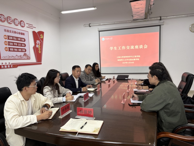 2025年11月18日,上海大学材料科学与工程学院于亚静、张望和孟俊行一行3人来访我院调研交流。学院党委副书记兼纪委书记傅少伟及学生工作办公室成员参与交流会。