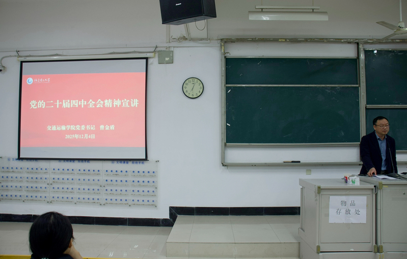 12月4日晚,交通运输学院在大教西4举行党的二十届四中全会精神宣讲会,学院党委书记曾金盾作宣讲报告。活动由辅导员申杨敏主持,旗山校区2025级全体本科新生200多人参加学习。