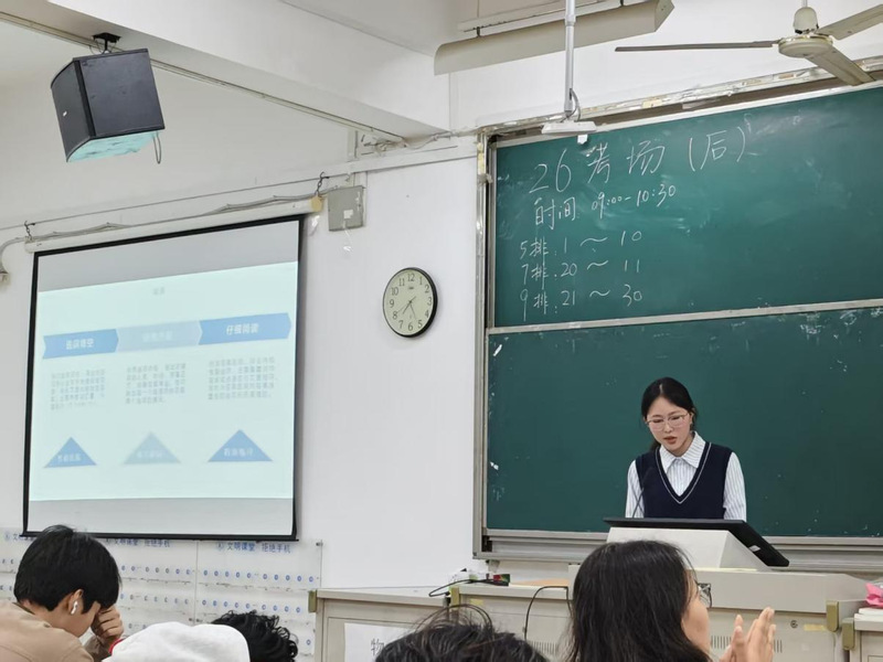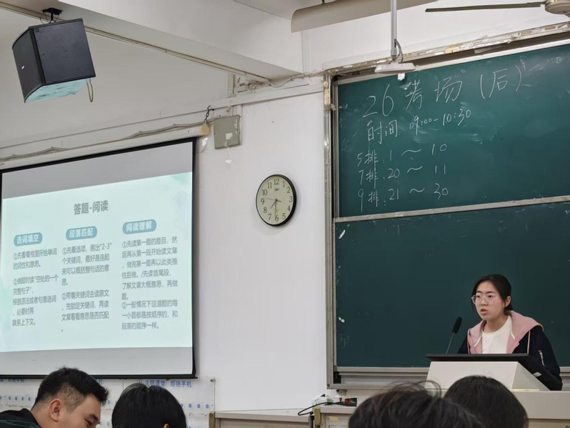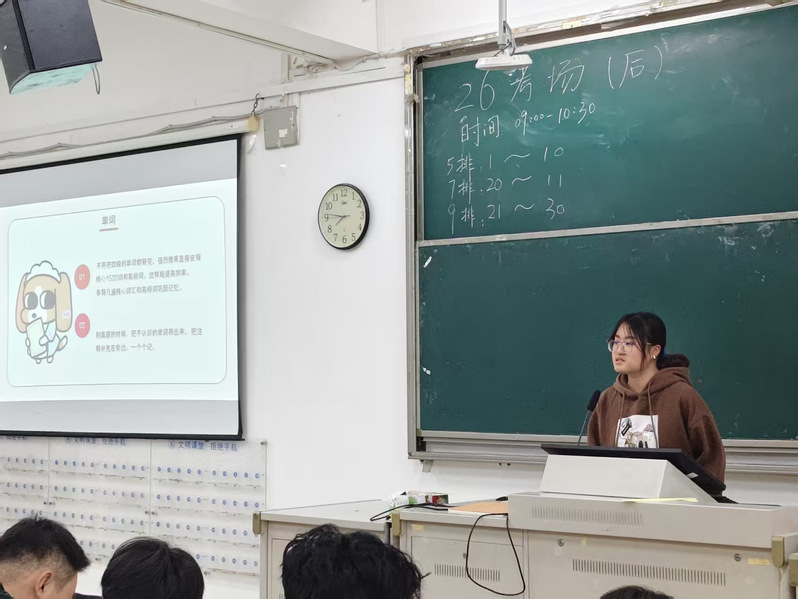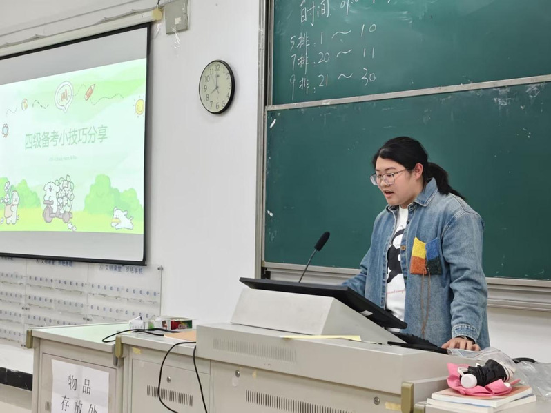 分享环节中,12位优秀学子依次上台,围绕单词、听力、阅读、写作、翻译等模块分享了各自的备考心得。多位同学强调单词是基础,建议优先背高频词并结合真题语境进行记忆。在具体方法上,分享内容涵盖系统备考框架、长期时间规划、听力训练体系、短期冲刺技巧、以及应试心态调整等多个维度,为同学们提供了多元化的备考思路。分享结束后,辅导员申杨敏老师鼓励大家不必过度焦虑,四级难度适中,方法得当即可顺利通过。